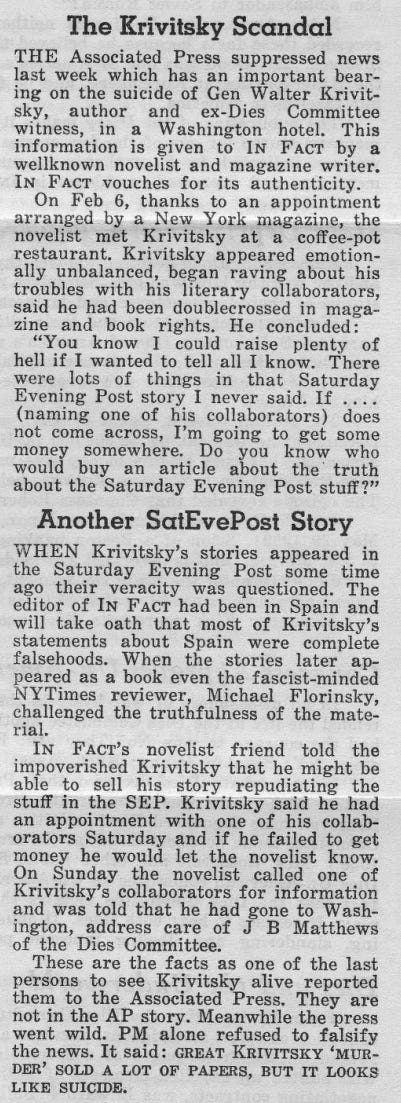 Well, Seldes chose to believe the suicide theory. He thought the press was being sensationalistic with a story that was closed and declared a suicide by the authorities. Ignace Reissâ wife believed the same thing. And yet plenty of Krivitskyâs âcolleaguesâ did not buy it, they knew it was a soviet crime. The press certainly thought there was something fishy. The evidence is full of holes and uncertainties, so all stories have problems.
