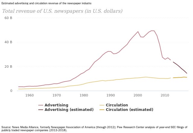 The yellow line is the money that the publishers get from selling papers to the public and the red one is the money they get from advertisers. You can read this graph in so many ways, you can adjust to inflation, and you can see what the petrodollar system did to the news business in the 70s, you can discuss the weirdness of the 80s, but none of that matters. The point is that Seldes was right and the percentage of revenue that came from advertisers only increased during the 20th century, that is, until ⊠the internet boom.